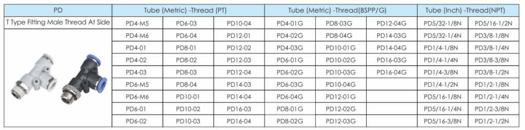 HOME > PD Series Plastic Fitting (T Type Fitting Male Thread at Side)